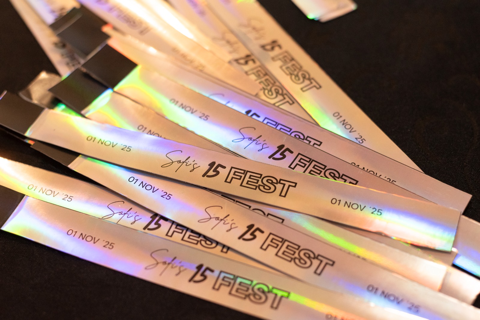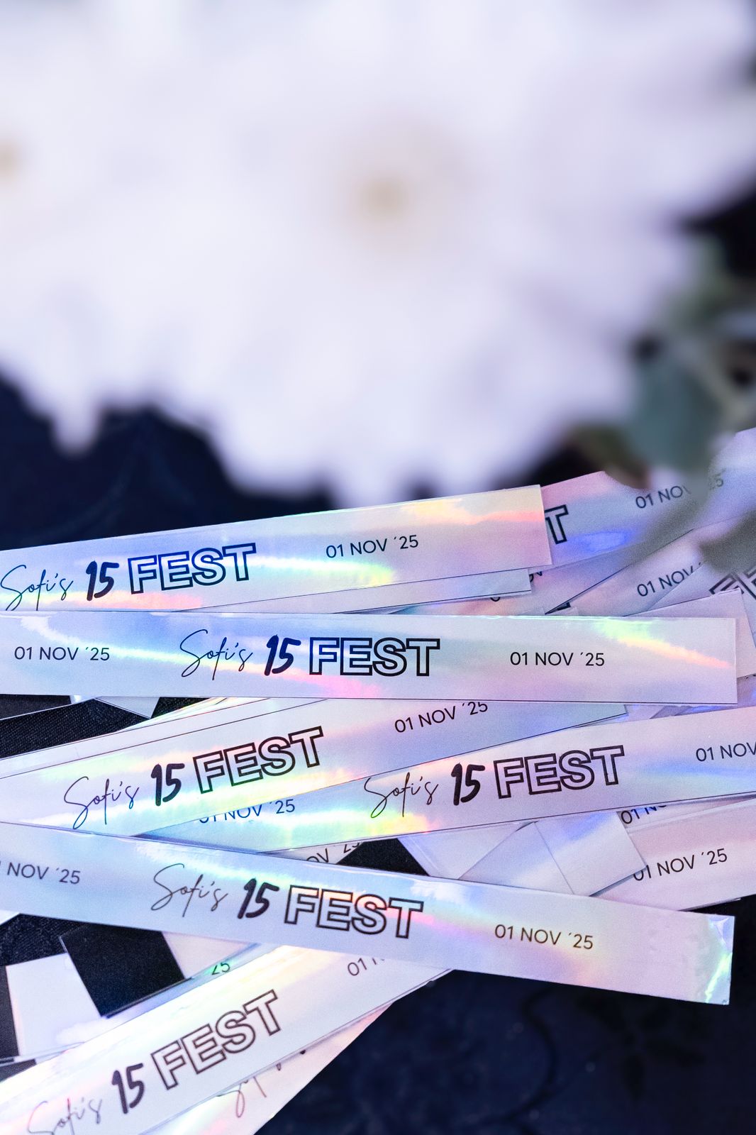 80 pulseras en vinilo holográfico de 25 x 2 cm, resistente y personalizada con tu diseño. Ideal para control de acceso, festivales, fiestas y eventos corporativos. Impresión de alta calidad con efecto holográfico brillante y duradero.